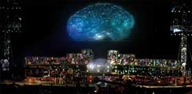 Nello sfondo un abbraccio dato da trecento lastre x-rays dipinte, vibranti per lanciare bagliori e lame di luce: la famosa installazione “EGHENETAI” su due muri semicircolari. Haime! Come sottolineato dallo stesso Bocelli in apertura di spettacolo il vento soffiava a 30 nodi e si sarebbe portato via i “cervelli” di Meneghetti: un vero coupe de teatre ma, la sicurezza ha smorzato gli entusiasmi vietandone il gonfiaggio.