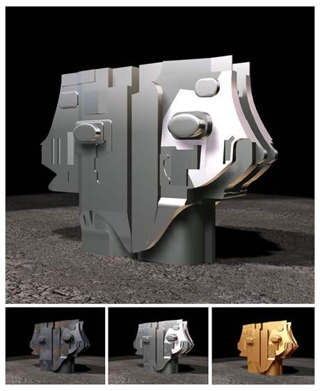 Technological Architecture for a contemporary reappraisal of the classic play on volumes, fullness and emptiness, light and shadow. Two profiles of human memory lend their form to the foliage of a centuries-old oak: mechanics becomes nature and nature becomes mechanics; it is time for the spirit of Beuys to return and plant the oaks of Kassel. The anterior and posterior facades, transferred and placed side by side in mirror-like fashion form a diapason of human resemblance: for an improbable yet possible harmony between man and nature. Man - machine – nature a possible trilogy in this technological era. Two threeliths make up this installation of megalithic inspiration which is not astrologically orientated; being devoted to the cult of sustainable progress it is not laid out as a circle it is laid out as a cube. A cromlech or menhir to technological perfection.